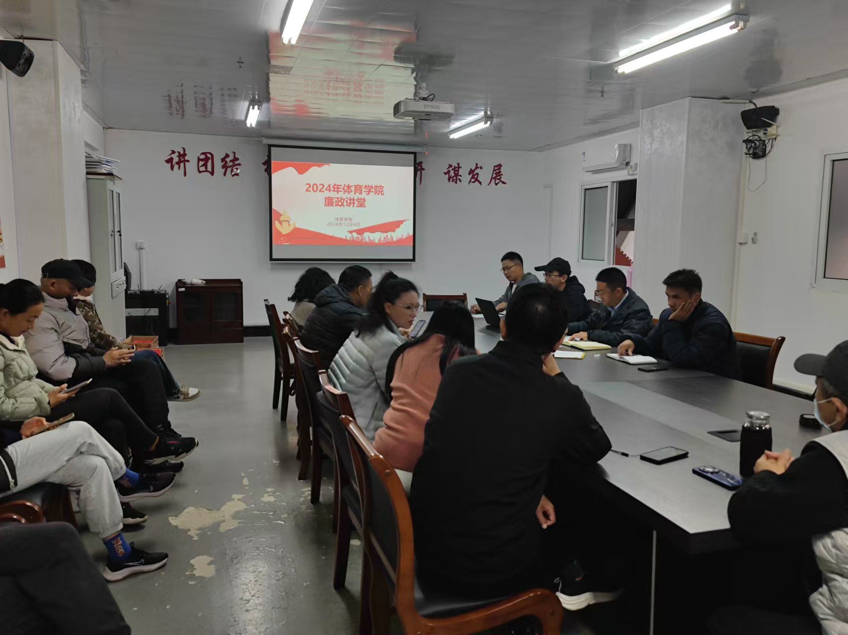 为深入学习贯彻党的二十届三中全会精神,进一步强化党员干部纪律作风建设,12月4日下午,体育学院党总支在南校区风雨操场会议室开展廉政讲堂学习教育活动,学院党总支书记董学兴主持,全体教职工参加。