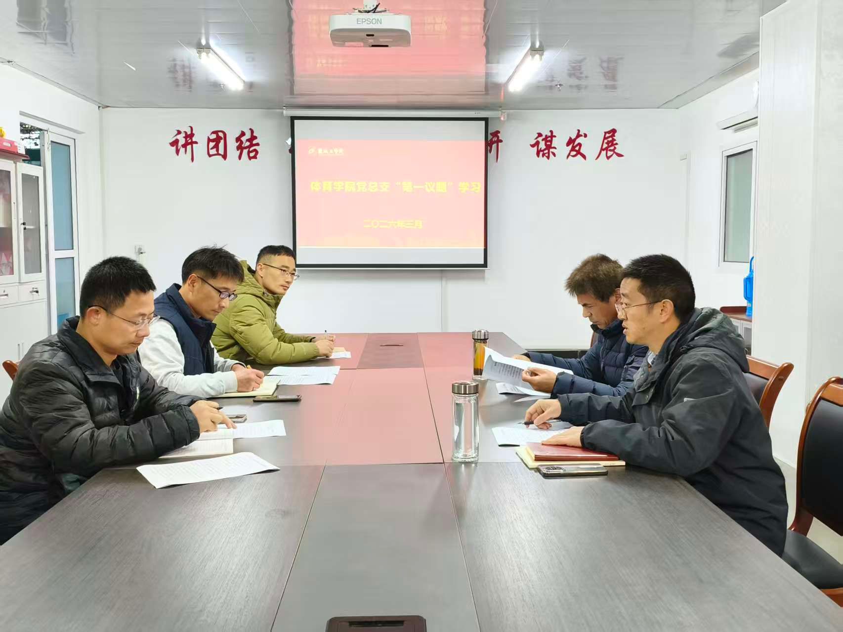 3月24日上午,在风雨操场会议室,体育学院党总支 “第一议题”学习习近平总书记重要讲话重要论述精神,学院党总支书记董学兴主持,全体党总支委员参加。